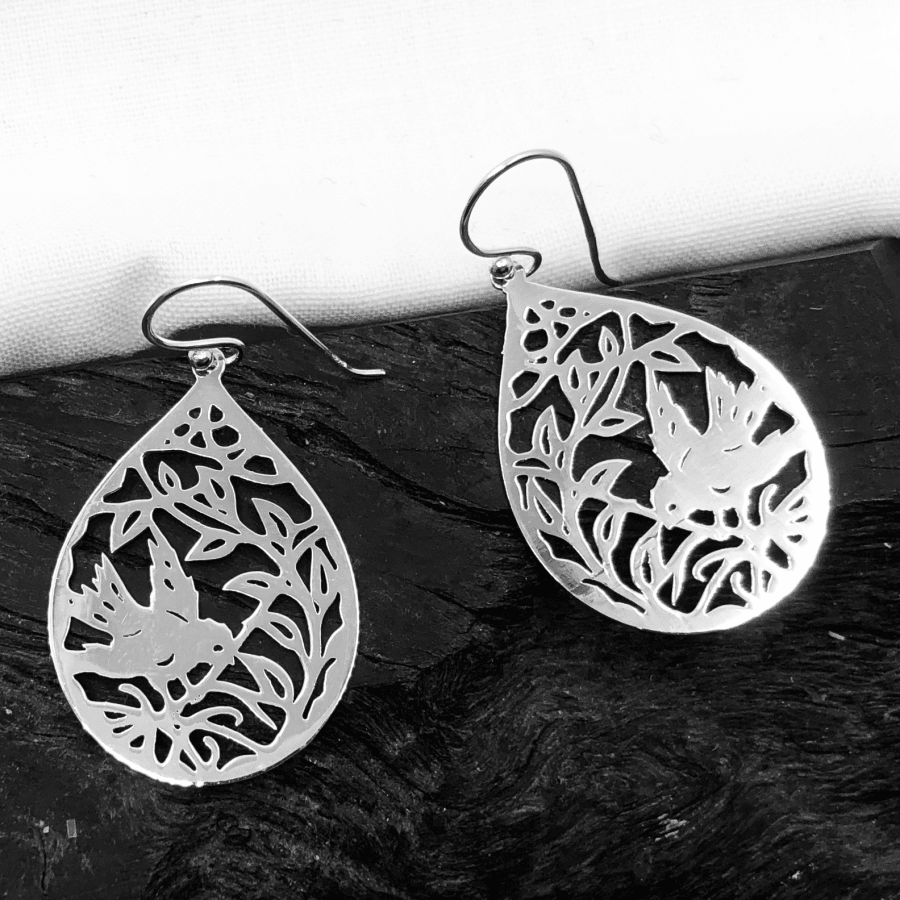 Sterling Silver Tear Shaped Earring with Bird on Branch