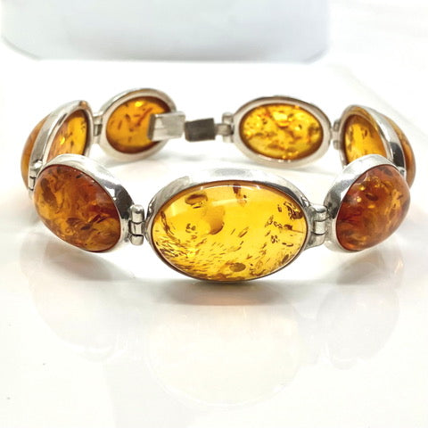 Amber and Sterling Silver 7 Oval Stone Bracelet
