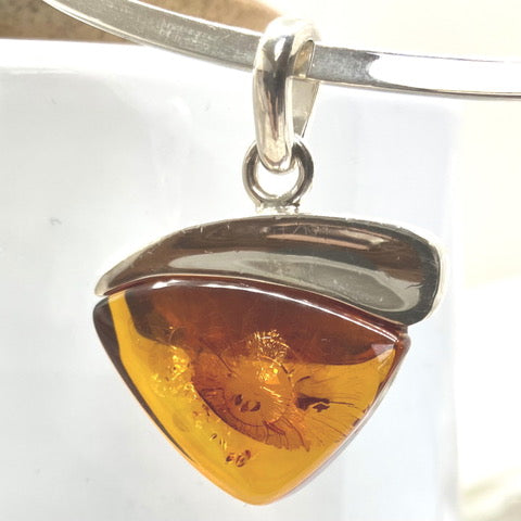 A triangle of amber sunshine handset in hallmarked sterling silver pendant. Comes on a round sterling silver torc.