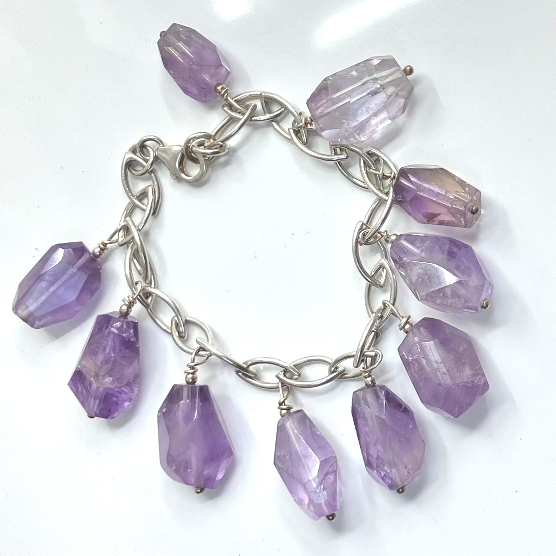 Amethyst and Sterling Silver Bracelet with 10 Cut Stone Charms