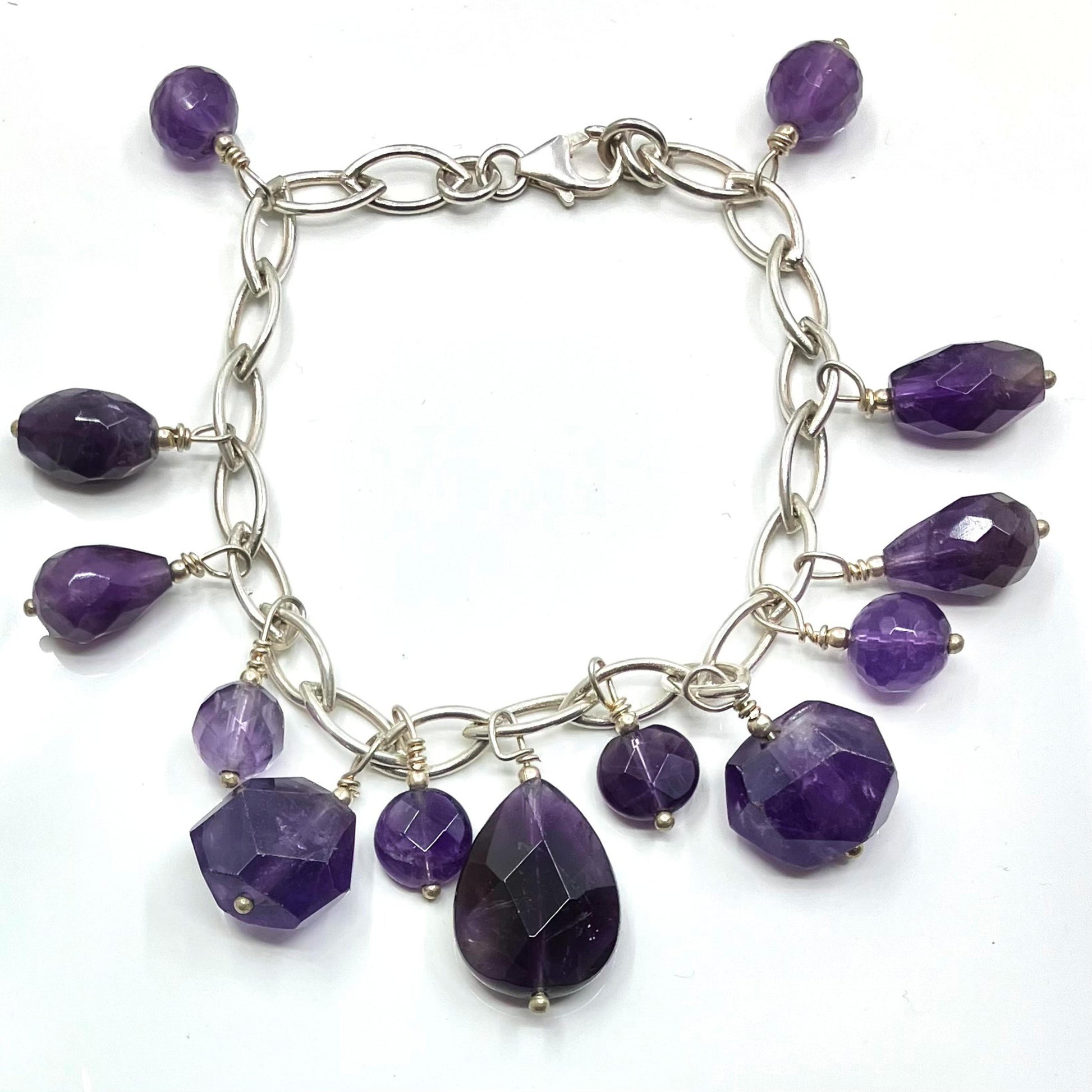 Amethyst and Sterling Silver Bracelet with 13 Cut Stone Charms