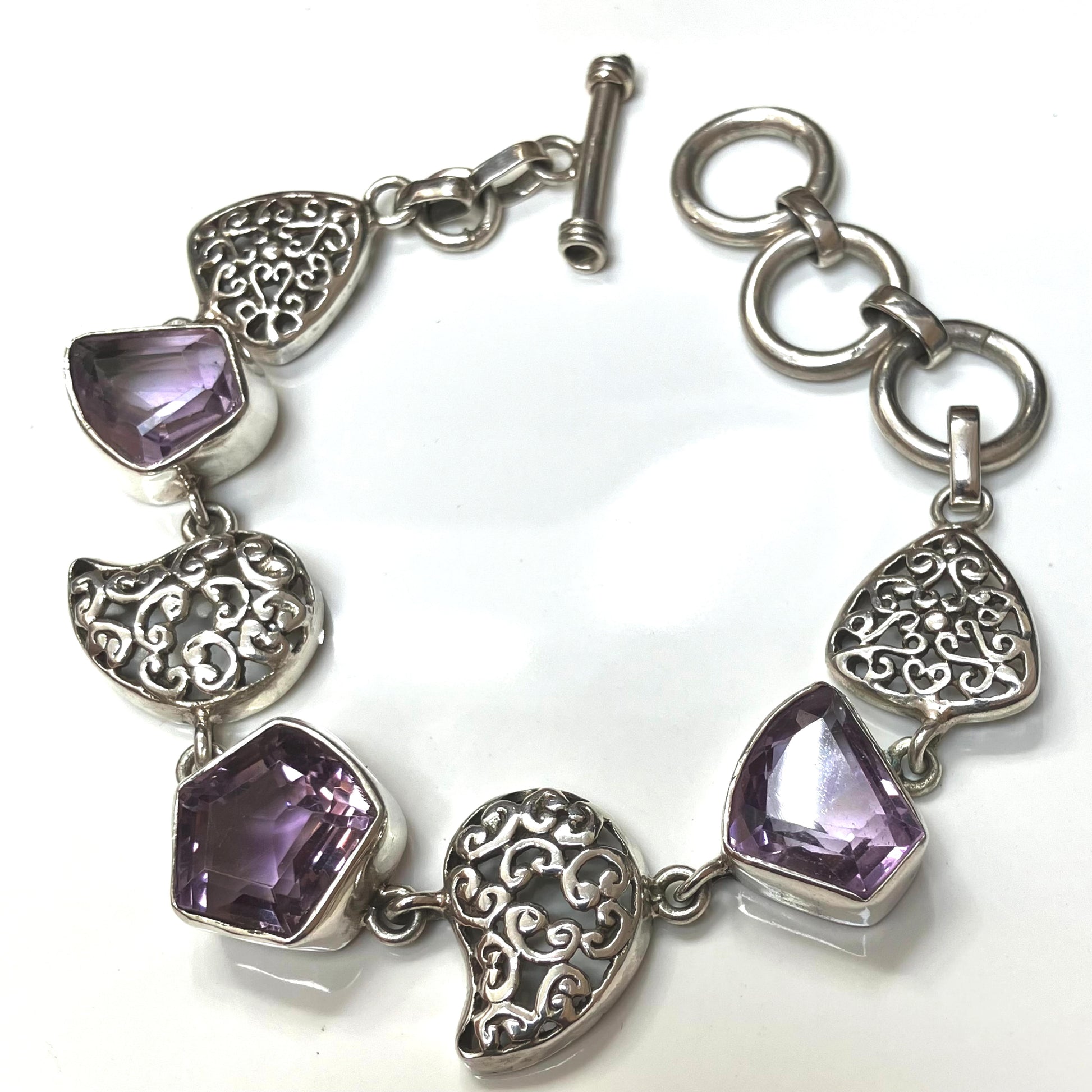 Amethyst and Sterling Silver Bracelet with 3 Cut Stones and 4 Silver Filigree Beads