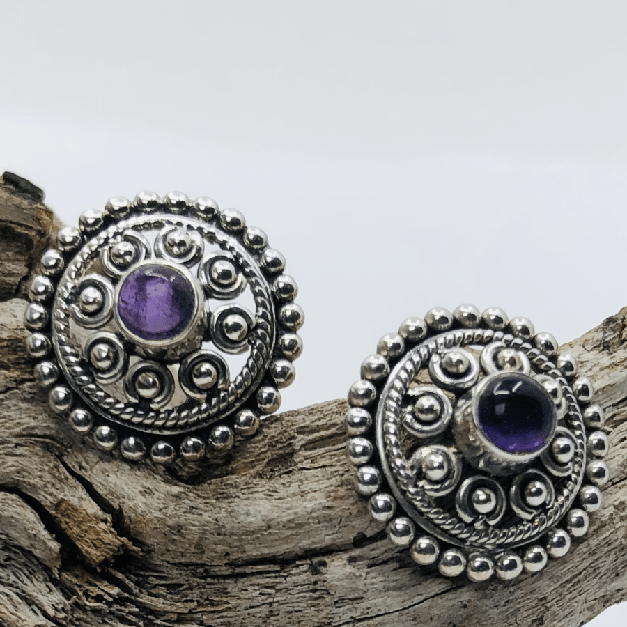 Natural Amethysts handset in these Hallmarked Sterling Silver Ethnic Style Studs.