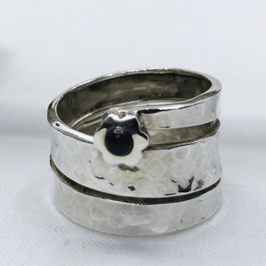 Band width is 15mm at the front and 10mm at the back and the ring comes in various sizes.