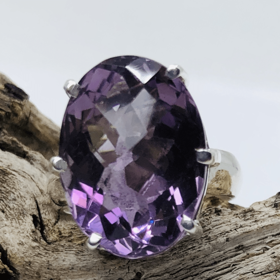 Sterling Silver Ring with Stunning Faceted Oval Amethyst in a Claw Setting.