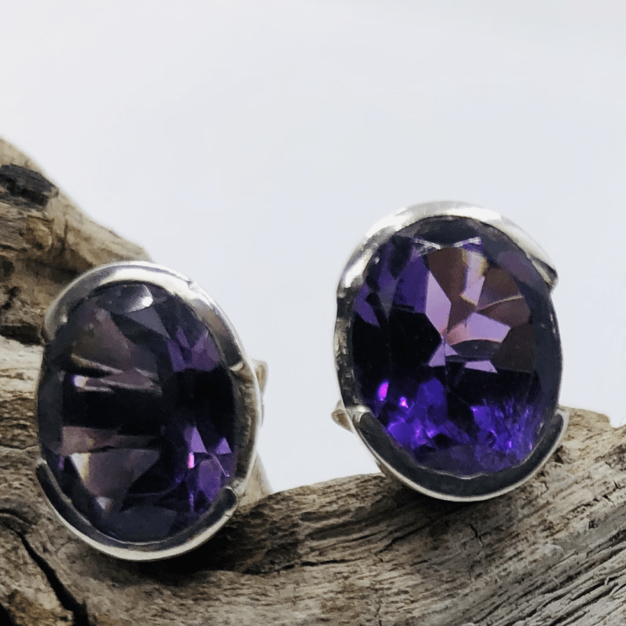 Hallmarked Sterling Silver Studs handset with Faceted Oval Natural Amethyst.