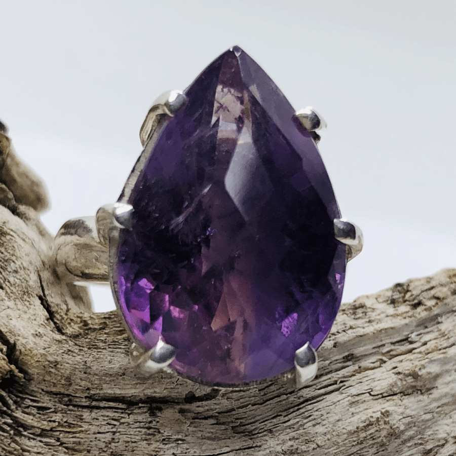Beautiful Pear shaped Faceted Amethyst Stone in a Sterling Silver Ring.