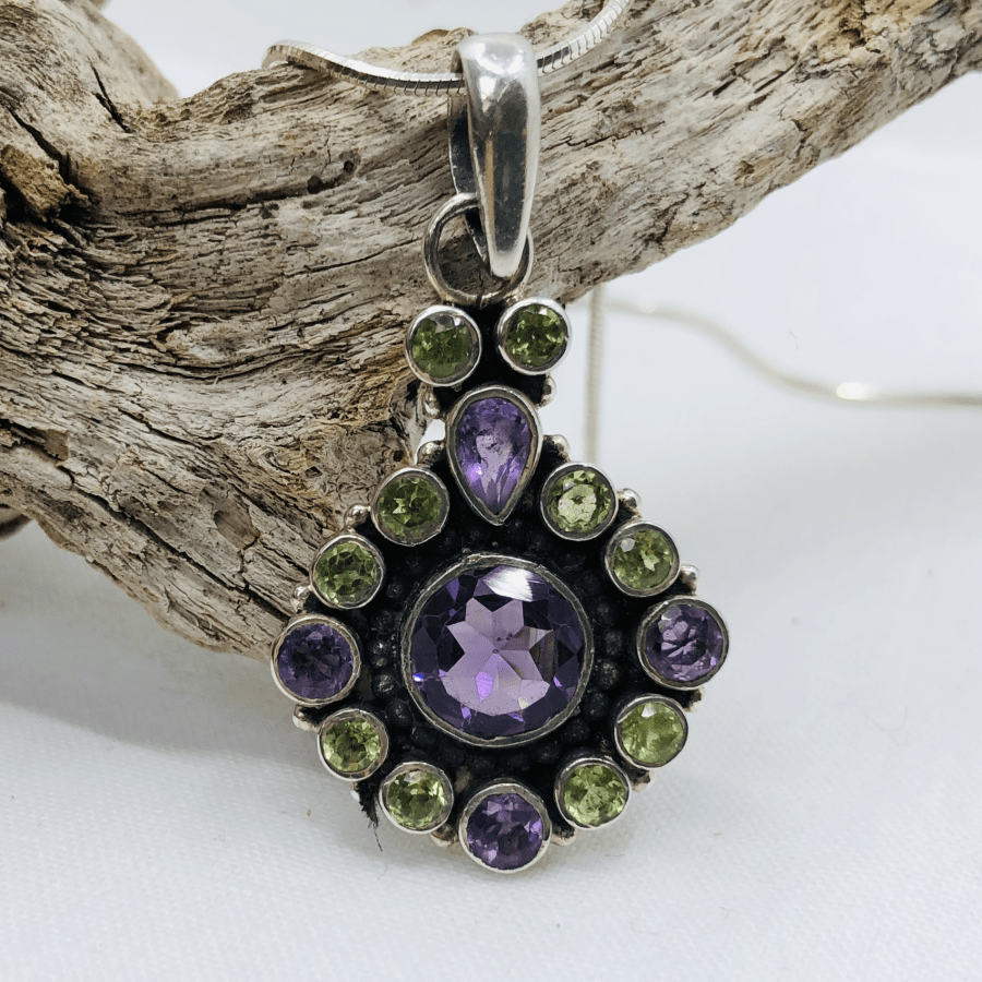 This Multi Stone Faceted Pendant has 5 Amethysts and 10 Peridots all hand set into a Hallmarked Sterling Silver Pendant.