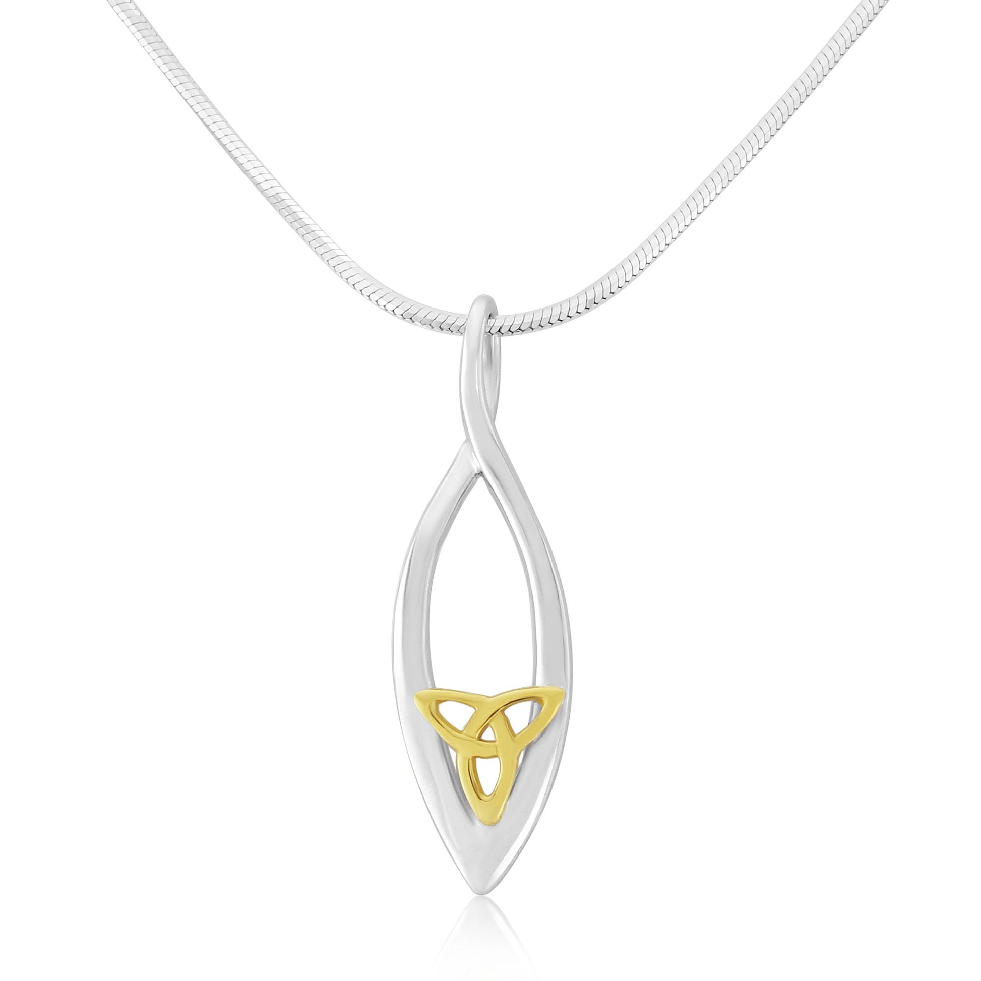 Irish Hallmarked Gold Plated Trinity Knot in Sterling Silver Eye Shaped Pendant with 16" Silver Shiny Chain.