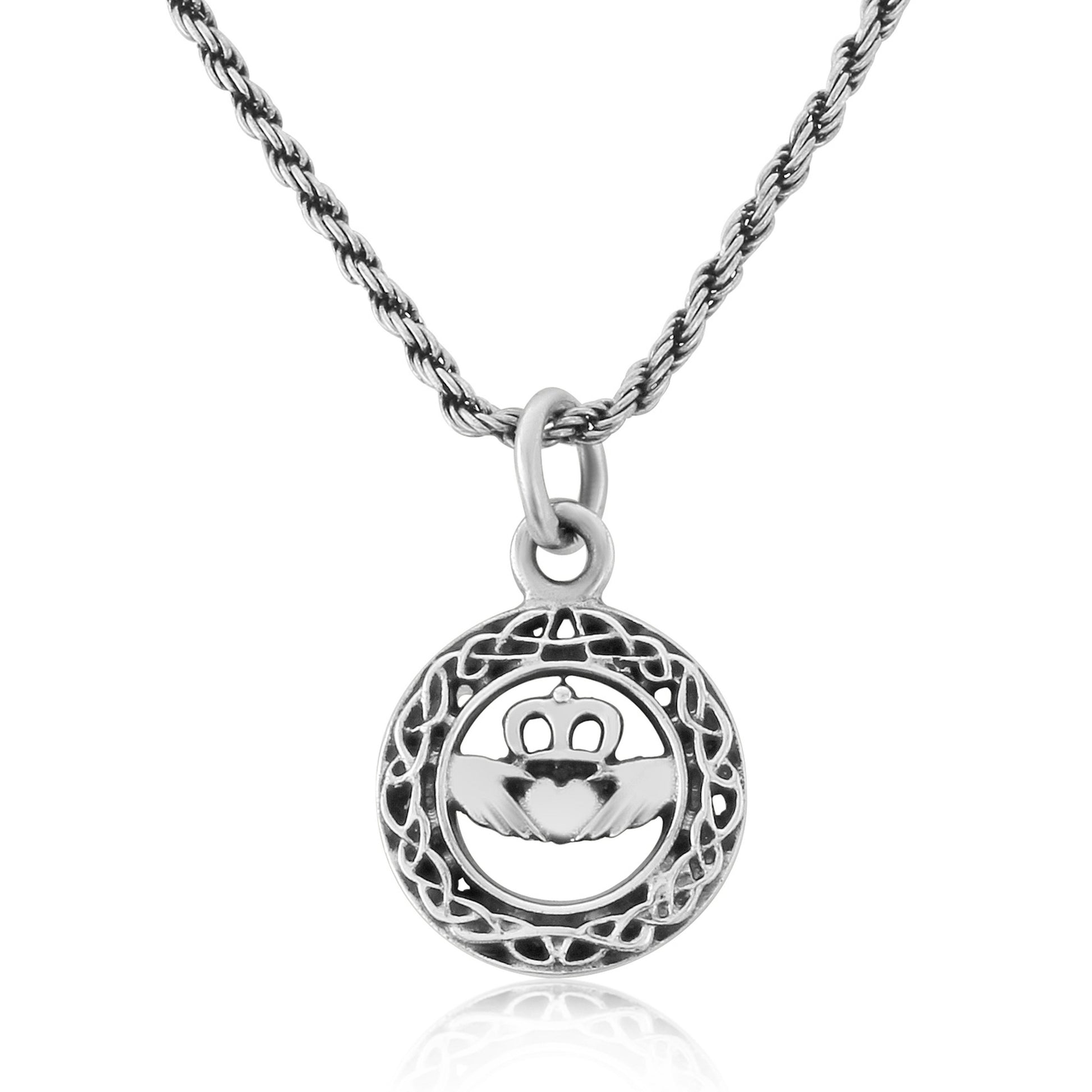 Claddagh Celtic Knot Oxidised Silver Circular Pendant and Chain