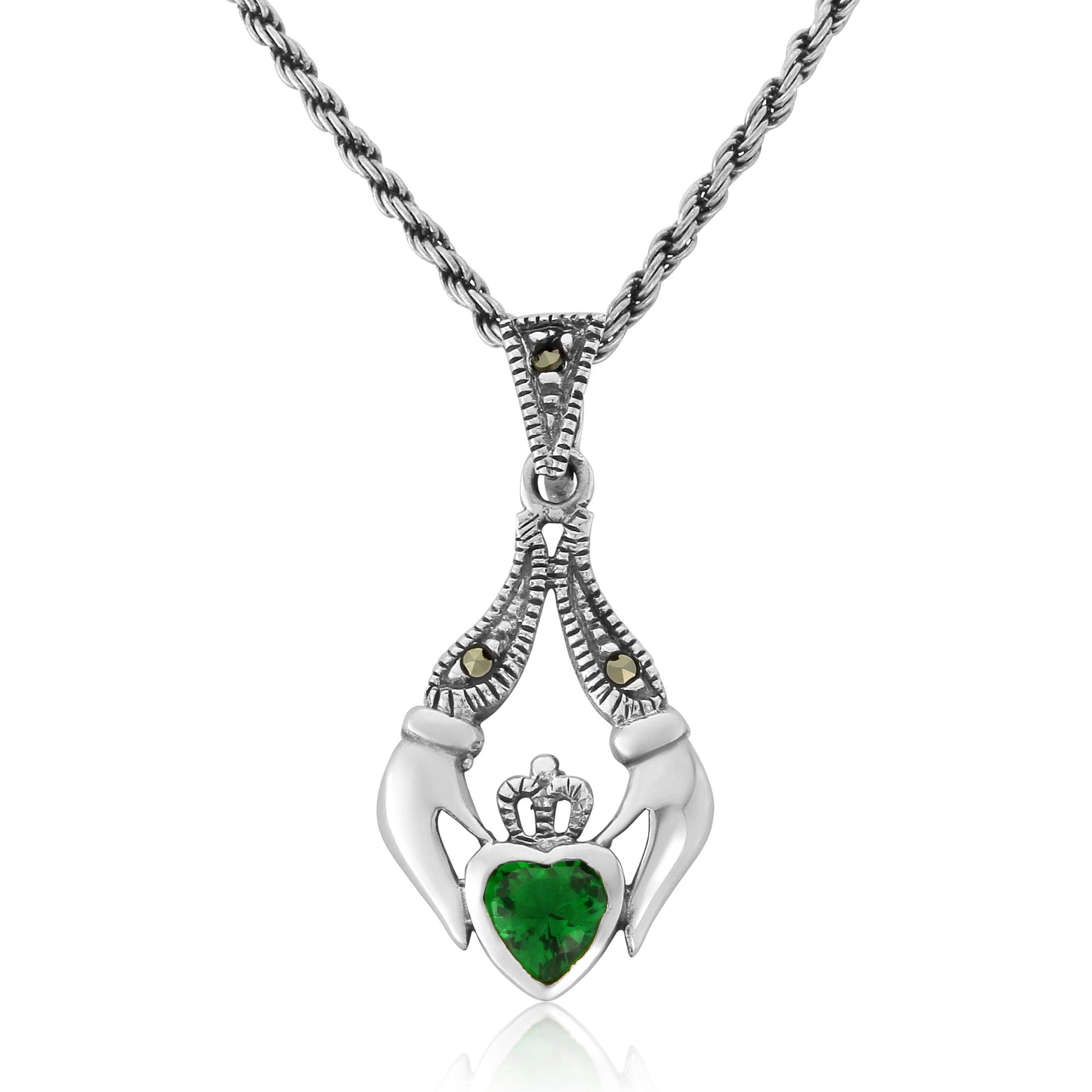 Claddagh Sterling Silver, Marcasite and Emerald CZ Pendant and Chain