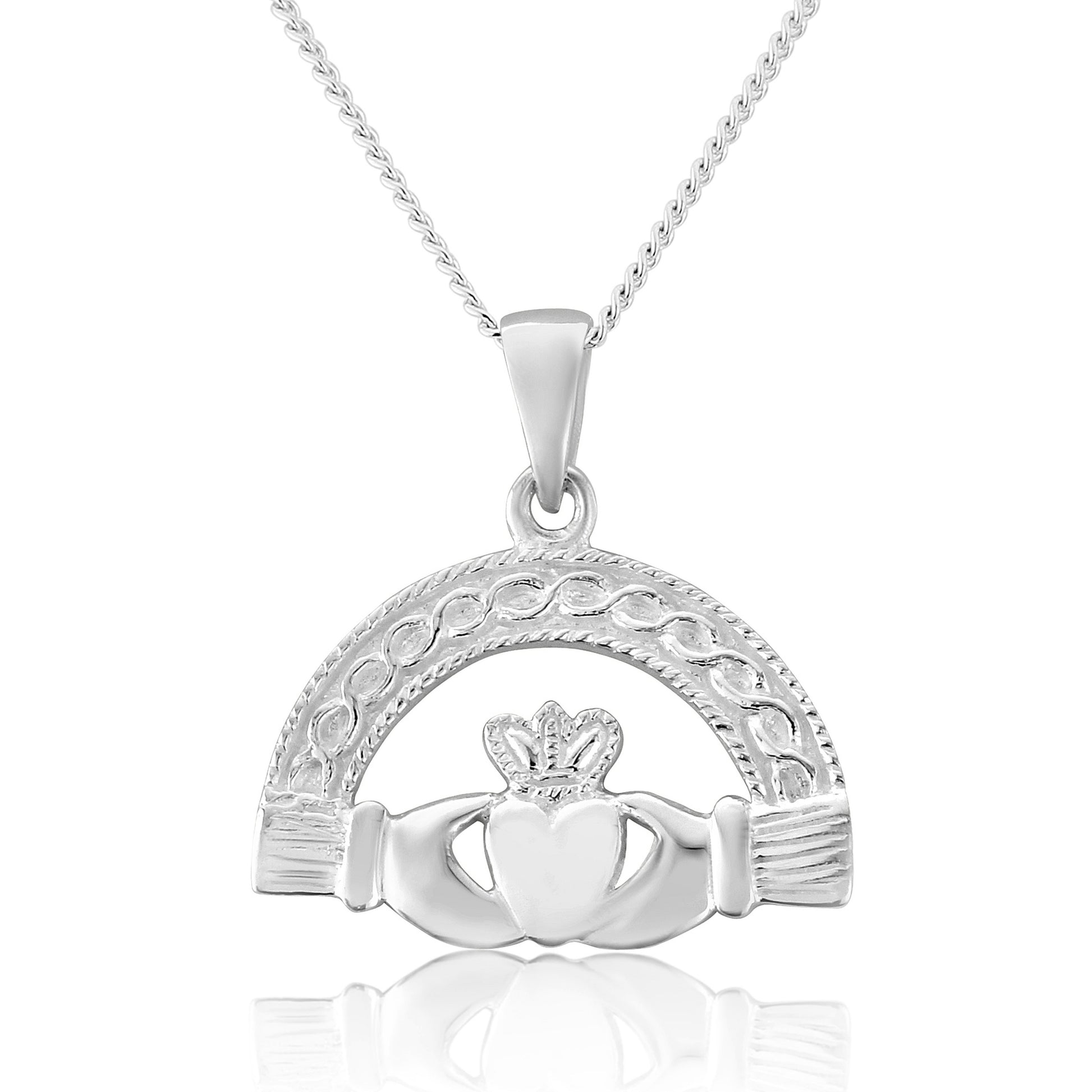 Irish Hallmarked Sterling Silver Semi Circle Celtic Claddagh Pendant and 16" (40cm) Sterling Silver Curb Chain.