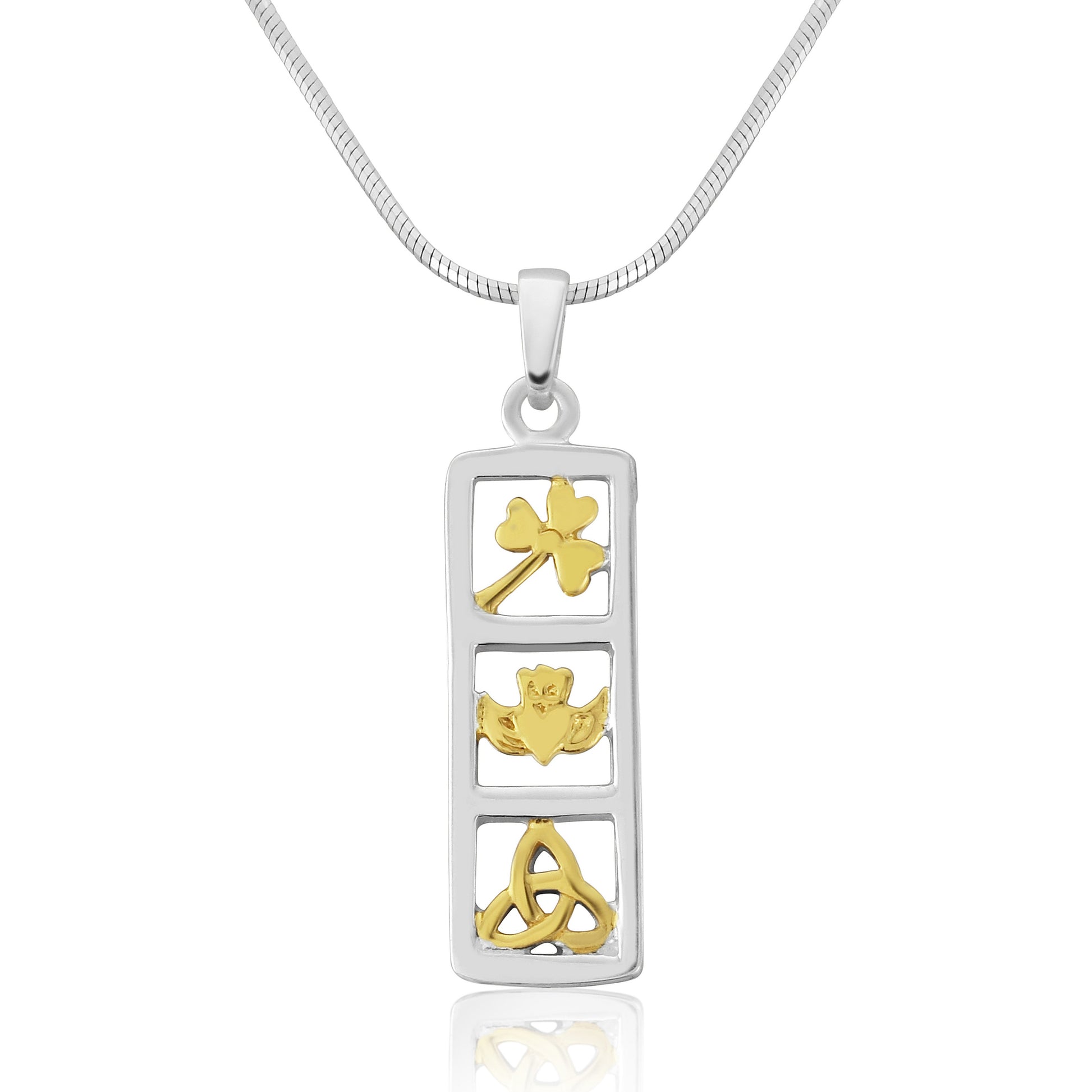 Irish Hallmarked Gold Plated Sterling Silver Shamrock, Claddagh and Trinity Knot Pendant and 16" (40cm) Shiny Sterling Silver Chain.