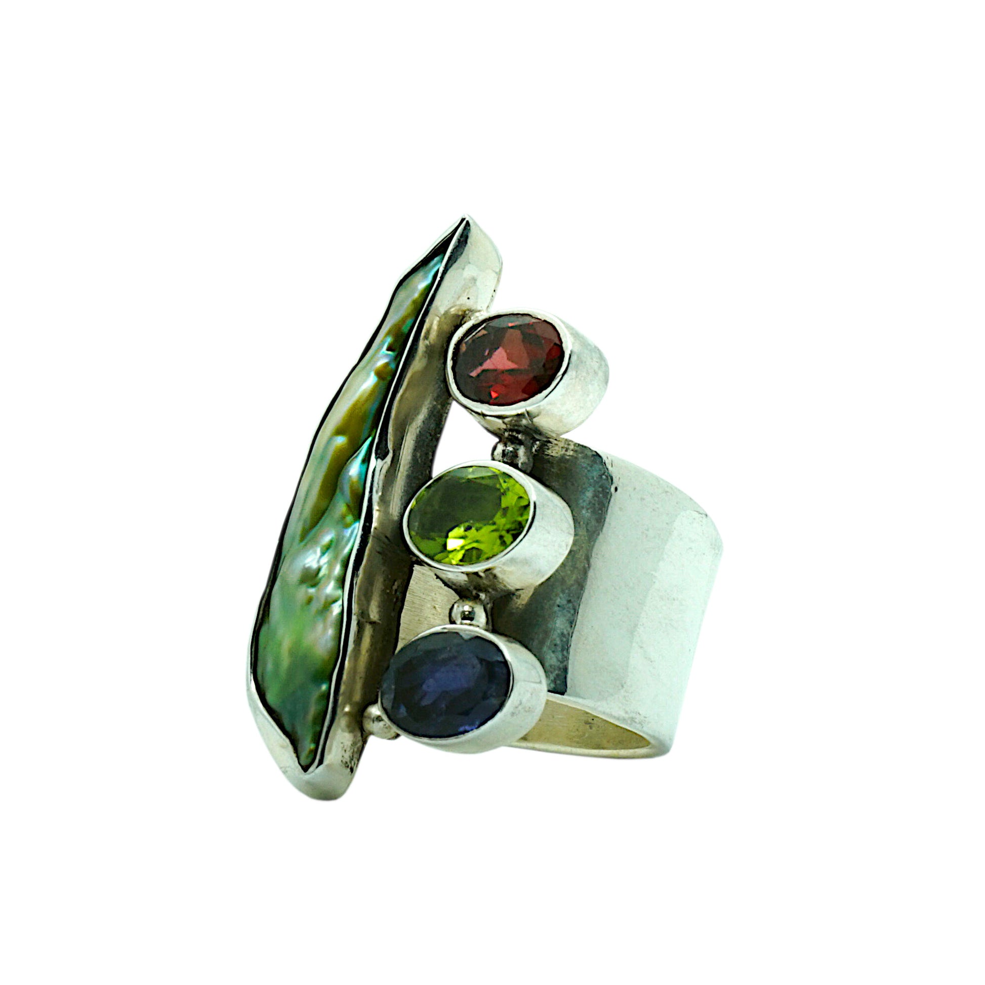 Freshwater Pearl with Garnet, Peridot and Iolite Sterling Silver Ring