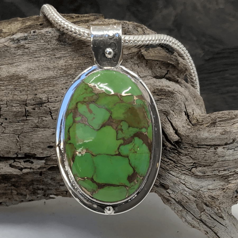 Irish Hallmarked Sterling Silver Handmade Pendant with a Green Turquoise Stone on a 16" (40cm) heavy Silver Snake Chain.