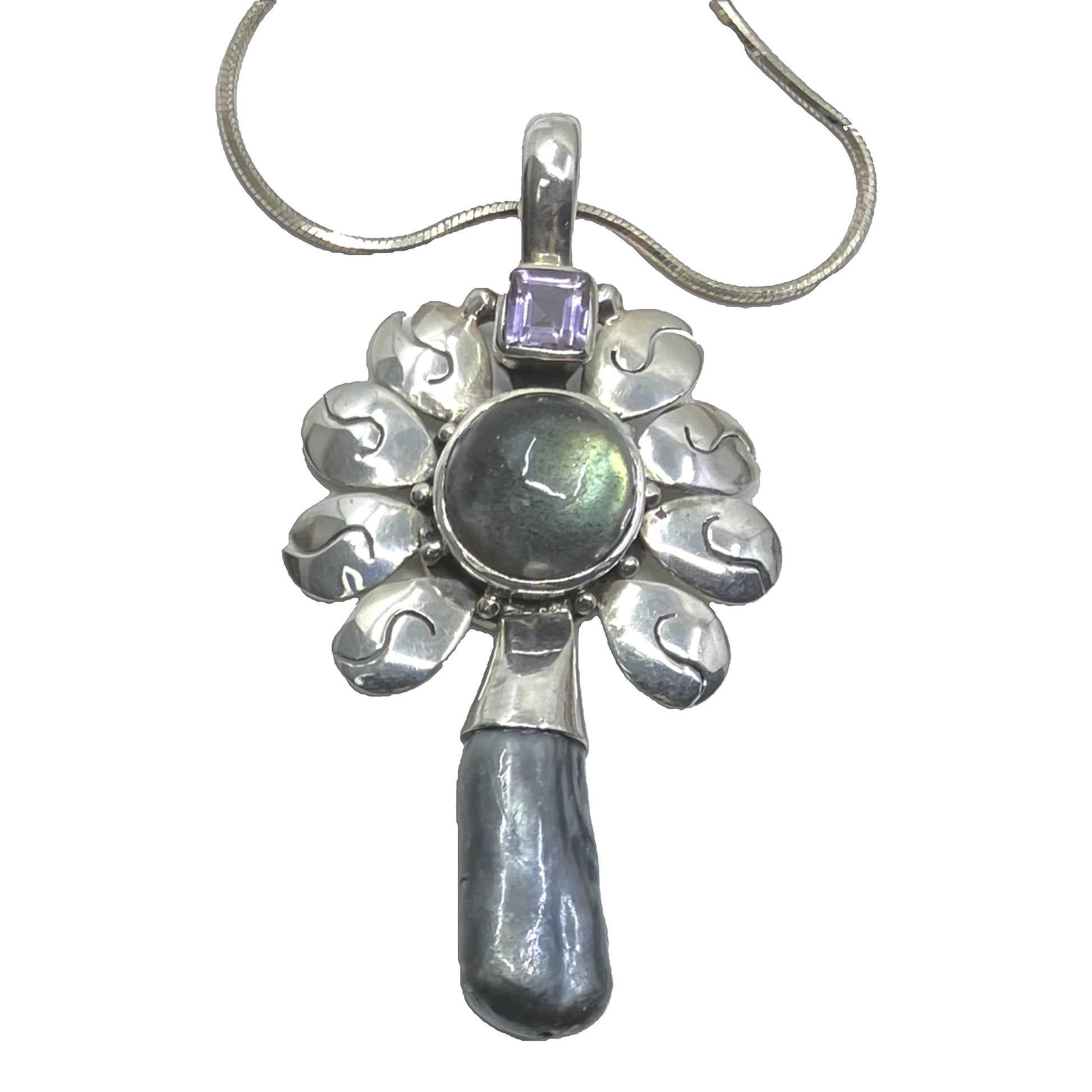 Flower shaped Sterling Silver Pendant with lovely round Labradorite center, a faceted Amethyst at the top and grey freshwater pearl stem.🌻❤️