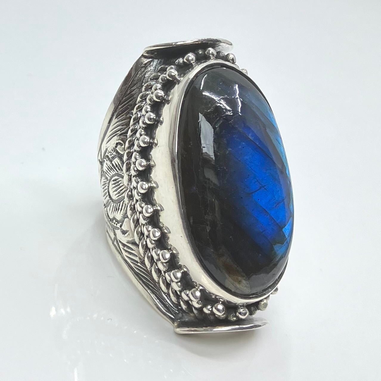 Dive into the deep blue of this stunning Labradorite Ring. The Sterling Silver setting features a floral design around the shank and it is Hallmarked by the Irish Assay Office.