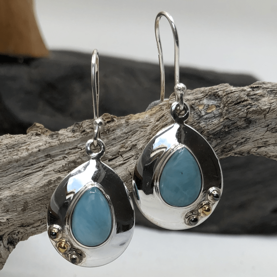 Irish Hallmarked Sterling Silver Earrings, with 2 Oxidised Silver Balls and one Gold, set with beautiful sky blue Larimar Stones.
