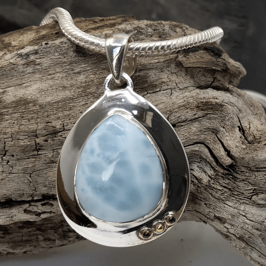 Larimar reflects a bright blue sky with a few dreamy white clouds. Very relaxing and goes with everything! It is a silicate mineral formed over 100 million years ago and is reputed to aid communication!