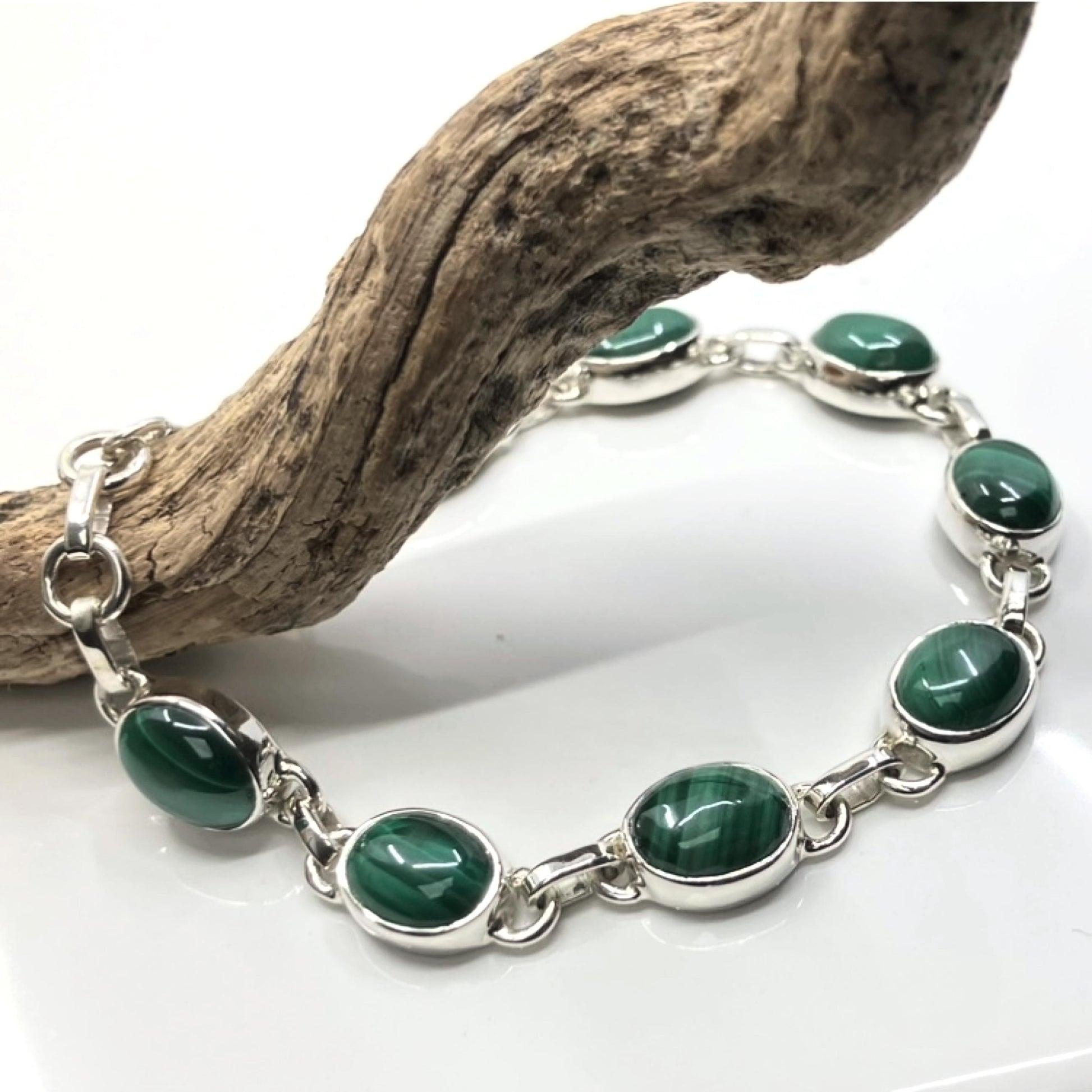 Malachite and Sterling Silver Bracelet 8 Ovals