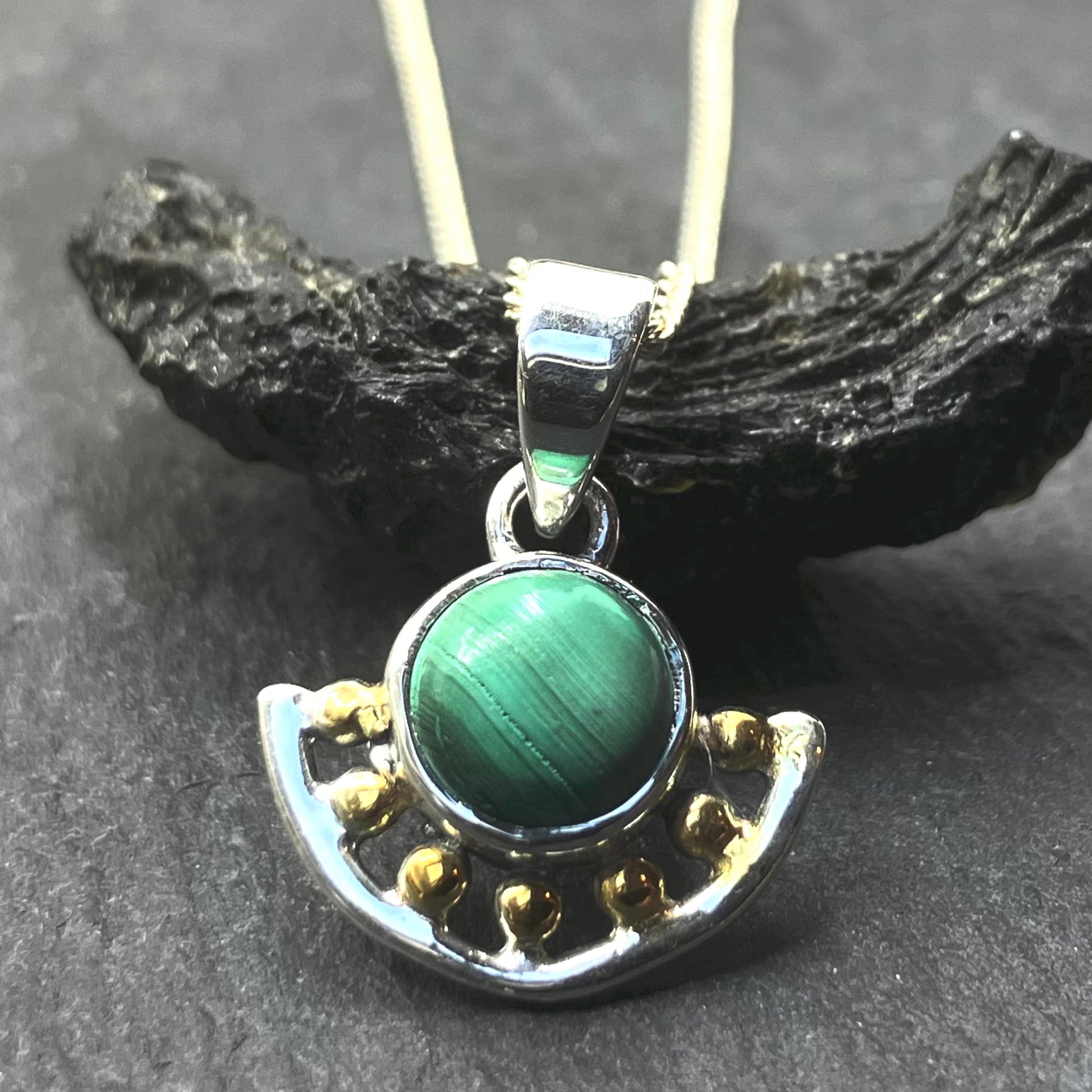 Dainty malachite pendant handset in sterling silver with 9ct gold ball decoration. Hallmarked in Dublin Castle guaranteeing fineness of the metals. Measures 15mm wide X 20mm long including bale.
