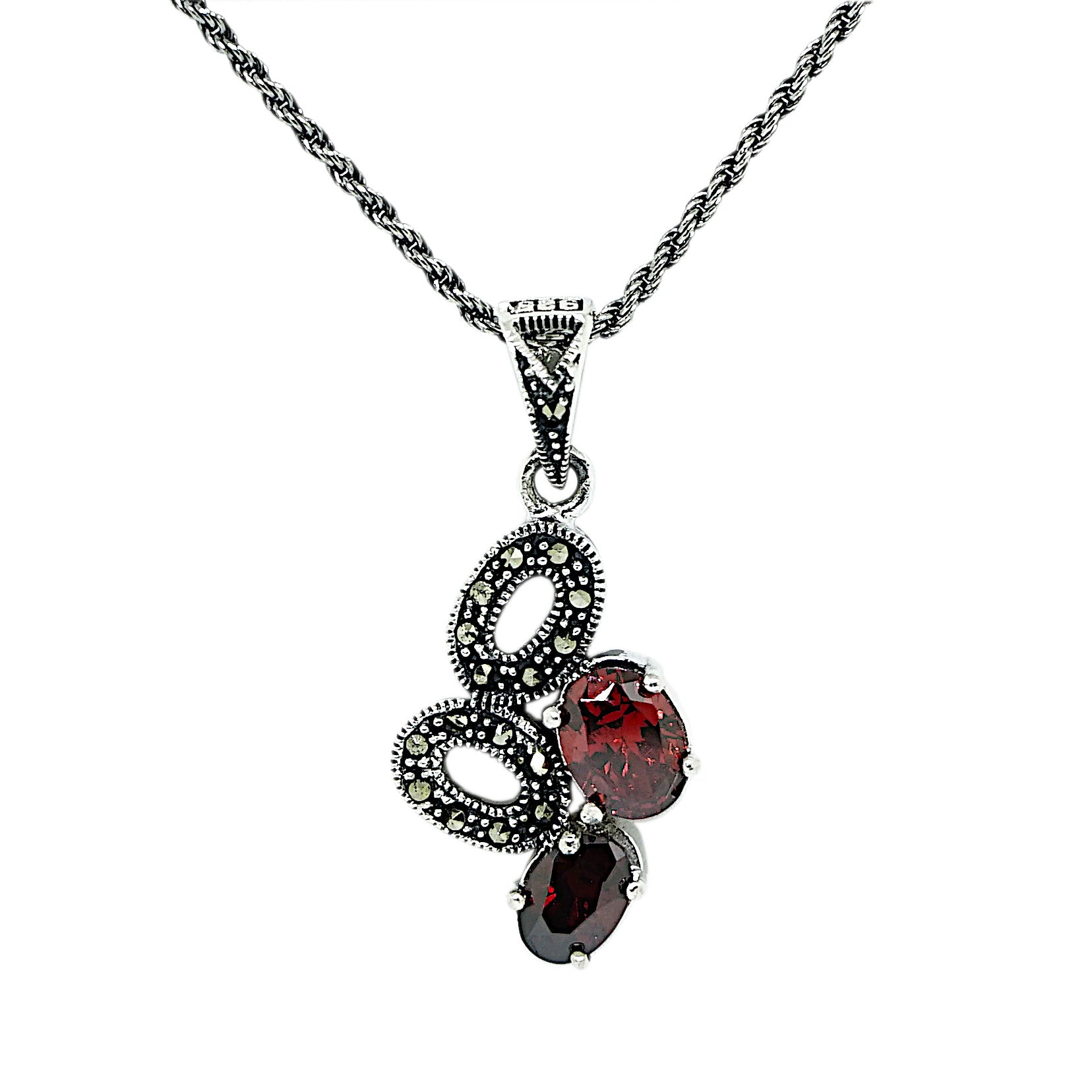Marcasite and Garnet Sterling Silver Pendant and Chain