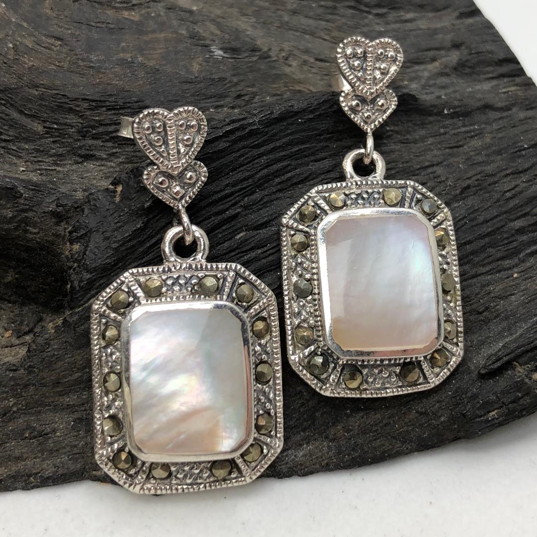 Irish Hallmarked Sterling Silver Marcasite and Mother of Pearl Drop Earrings with Stud Backs