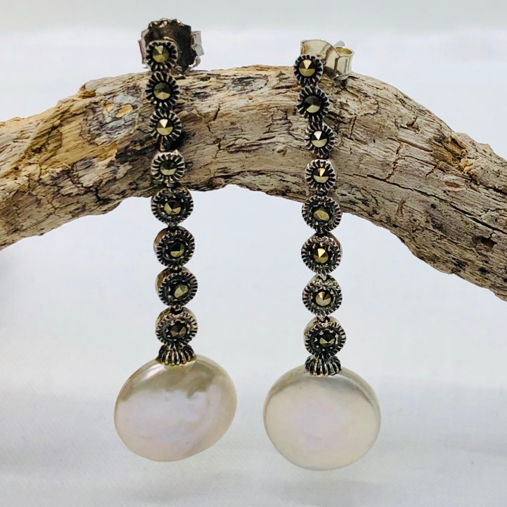 Irish Hallmarked Sterling Silver Marcasite and pearl long Drop Earrings.