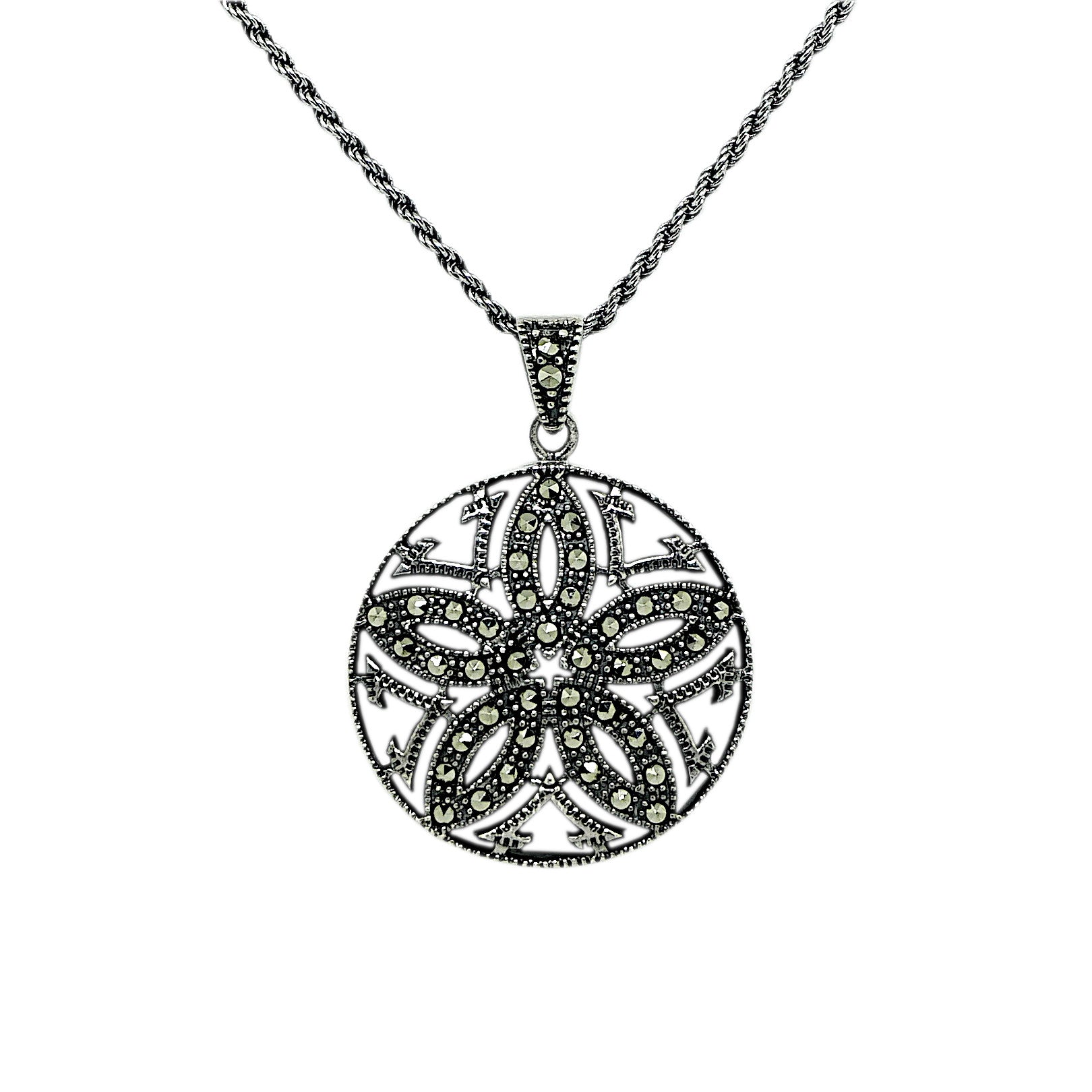 Marcasite and Sterling Silver Round Pendant and Silver Chain
