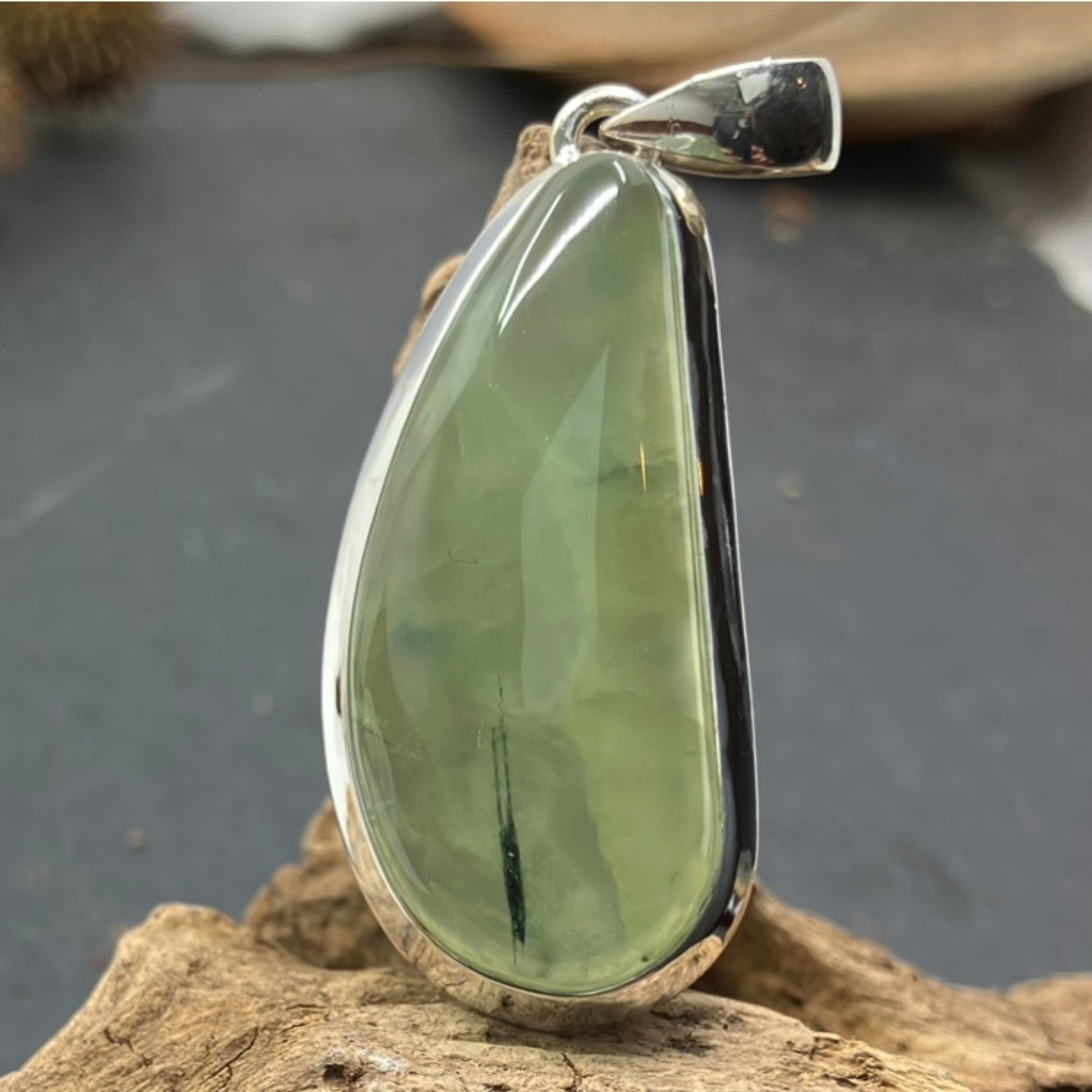 Handset Prehnite Stone in Sterling Silver and Hallmarked by Irish Assay Office in Dublin Castle. This calm green beauty measures 19mm wide x 50mm long including bale.