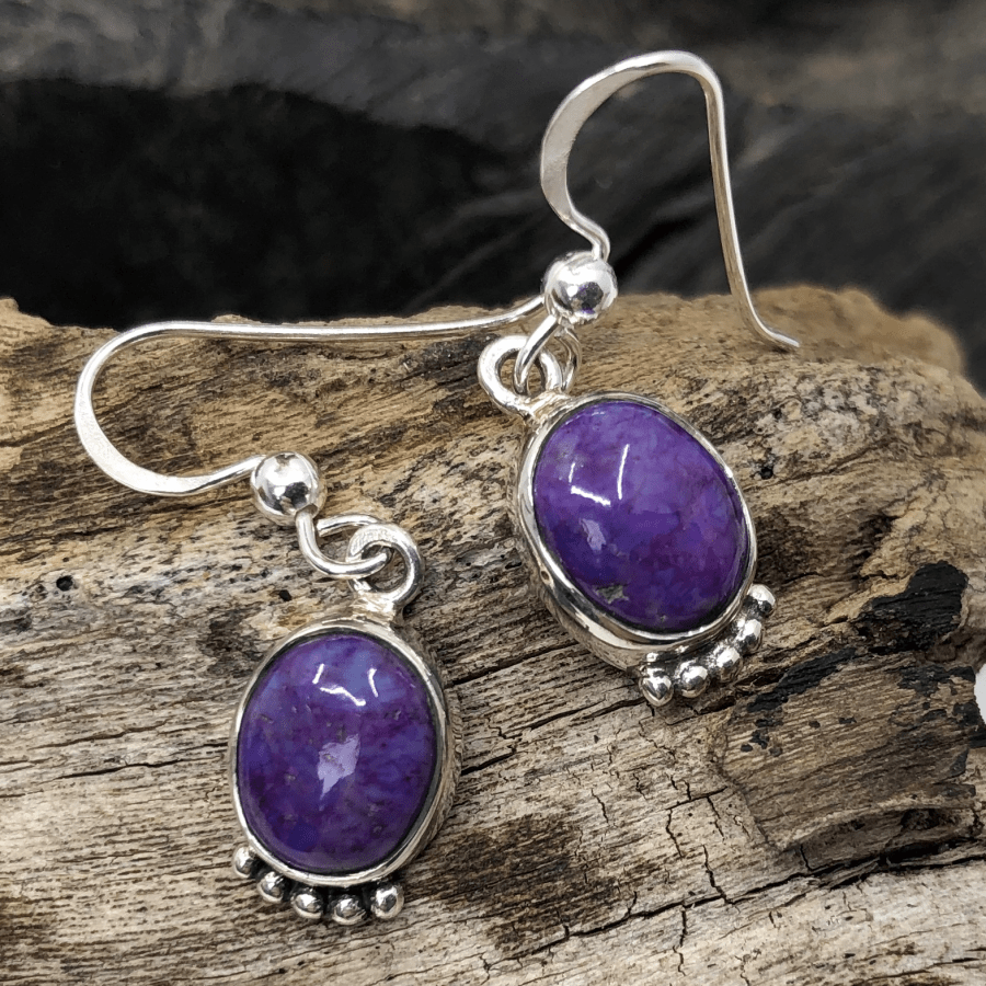 Beautifully Detailed Sterling Silver Earrings Handset with Oval Purple Turquoise Stones.