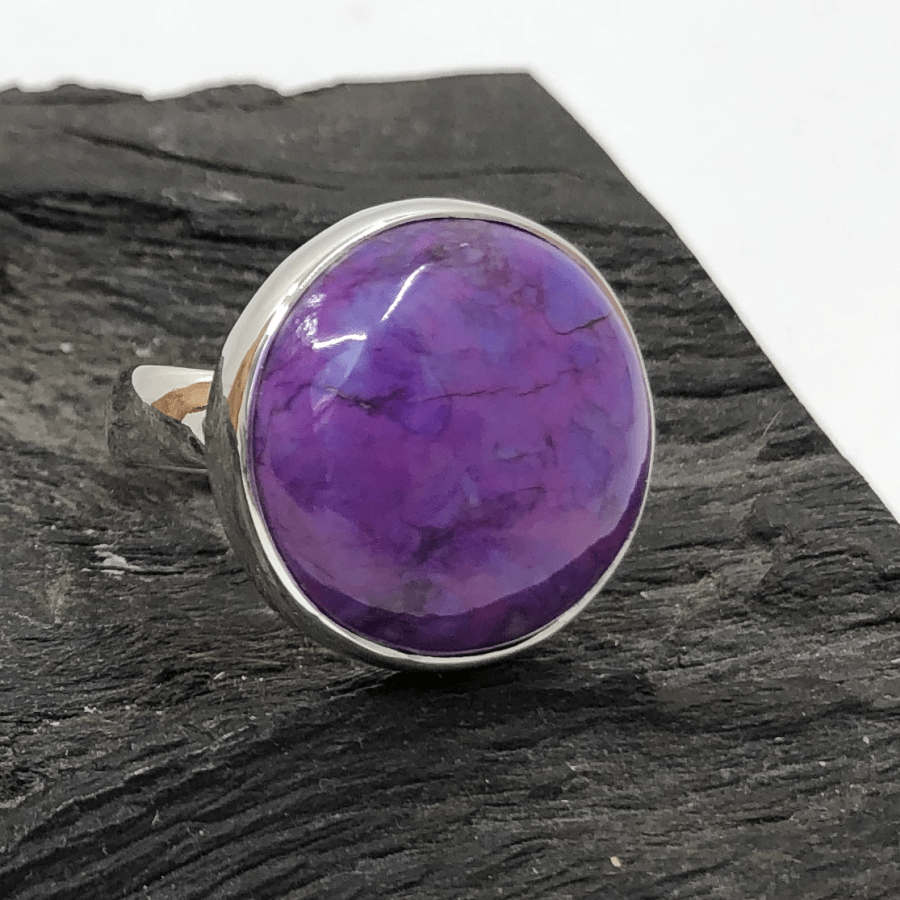 Hallmarked Sterling Silver Circular Ring with a Purple Turquoise Stone in a selection of sizes.