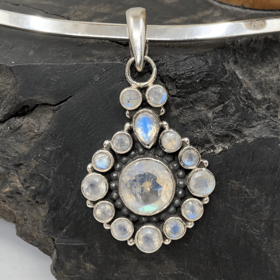 Fifteen faceted Rainbow Moonstones are set in this light catching Silver Pendant. It is shown on a Silver Torc.