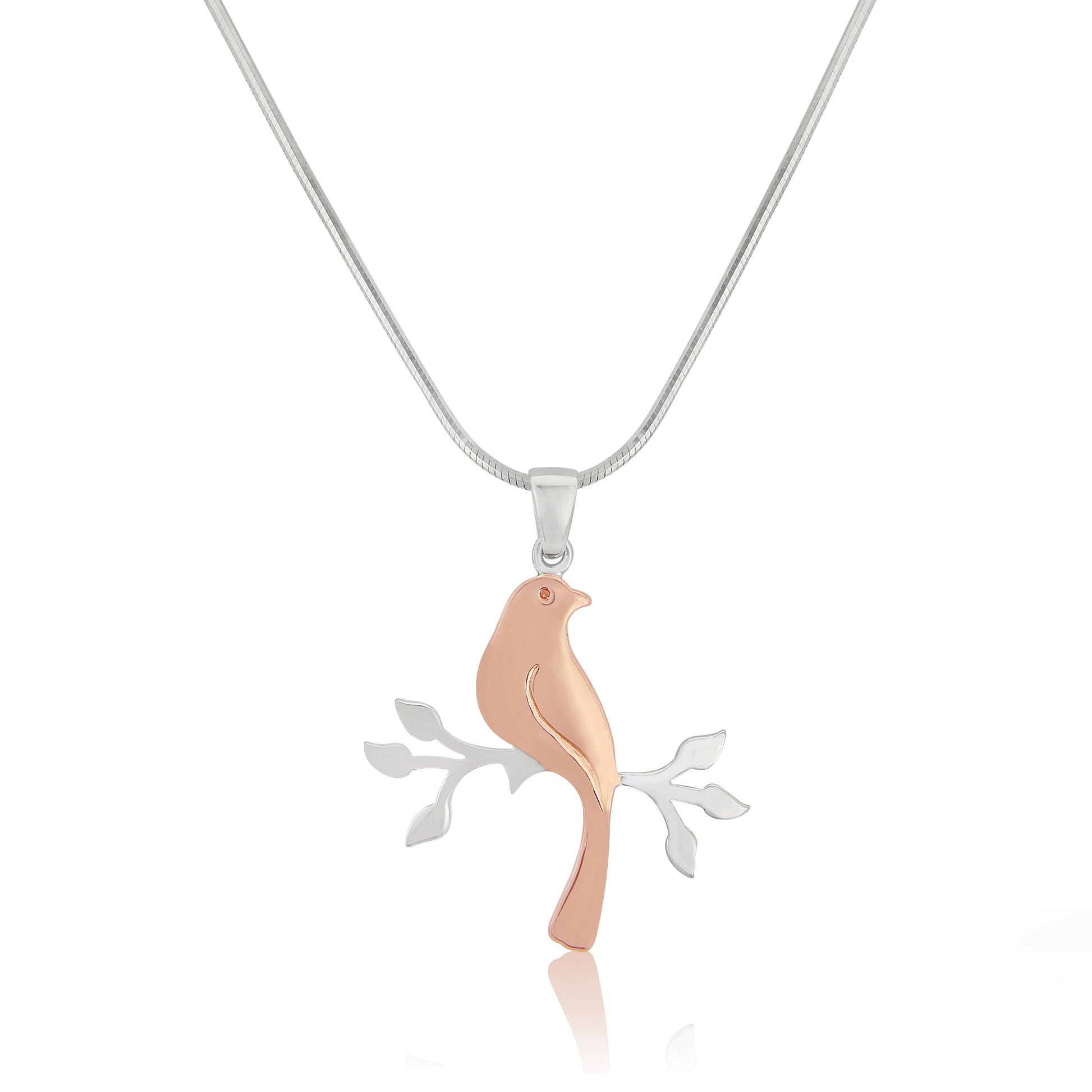 Rose Gold Plated Sterling Silver Bird on Branch Pendant and Silver Chain