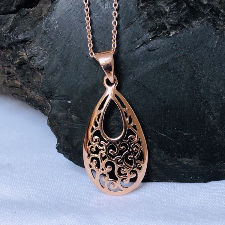 Lovely Rose Gold Plated Silver Tear Drop shaped Filigree Pendant on a 16" Rose Gold Plated Silver Chain.