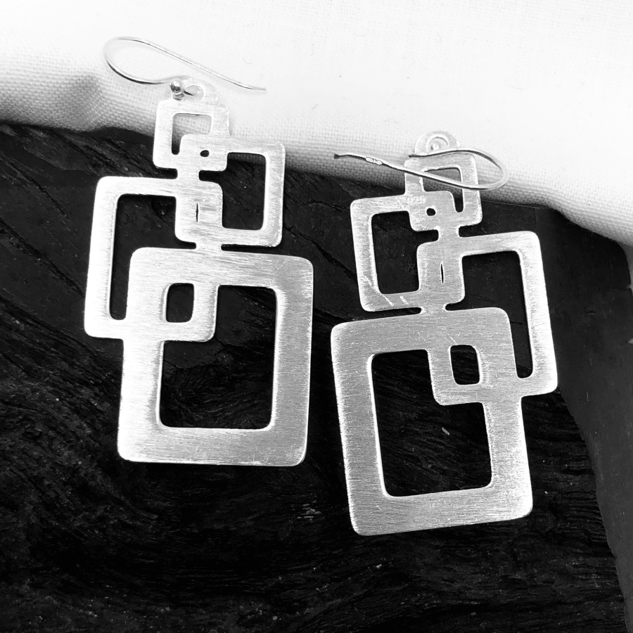 A Brushed Silver pair of Earrings with a Geometric Cut Out Pattern. Very Elegant and Minimalist❣️