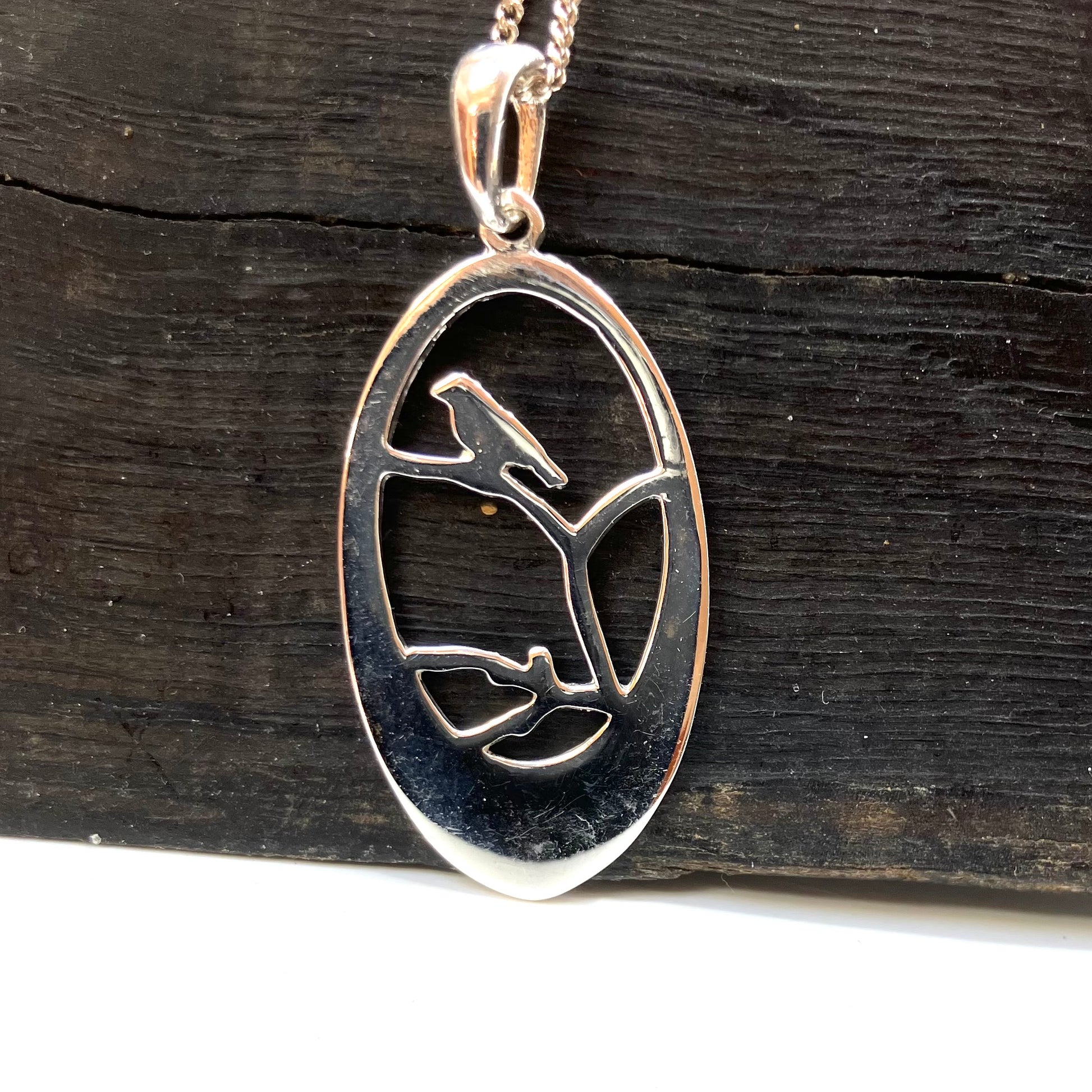 Elegant oval shaped Sterling Silver Pendant with a wee bird sitting in a tree.