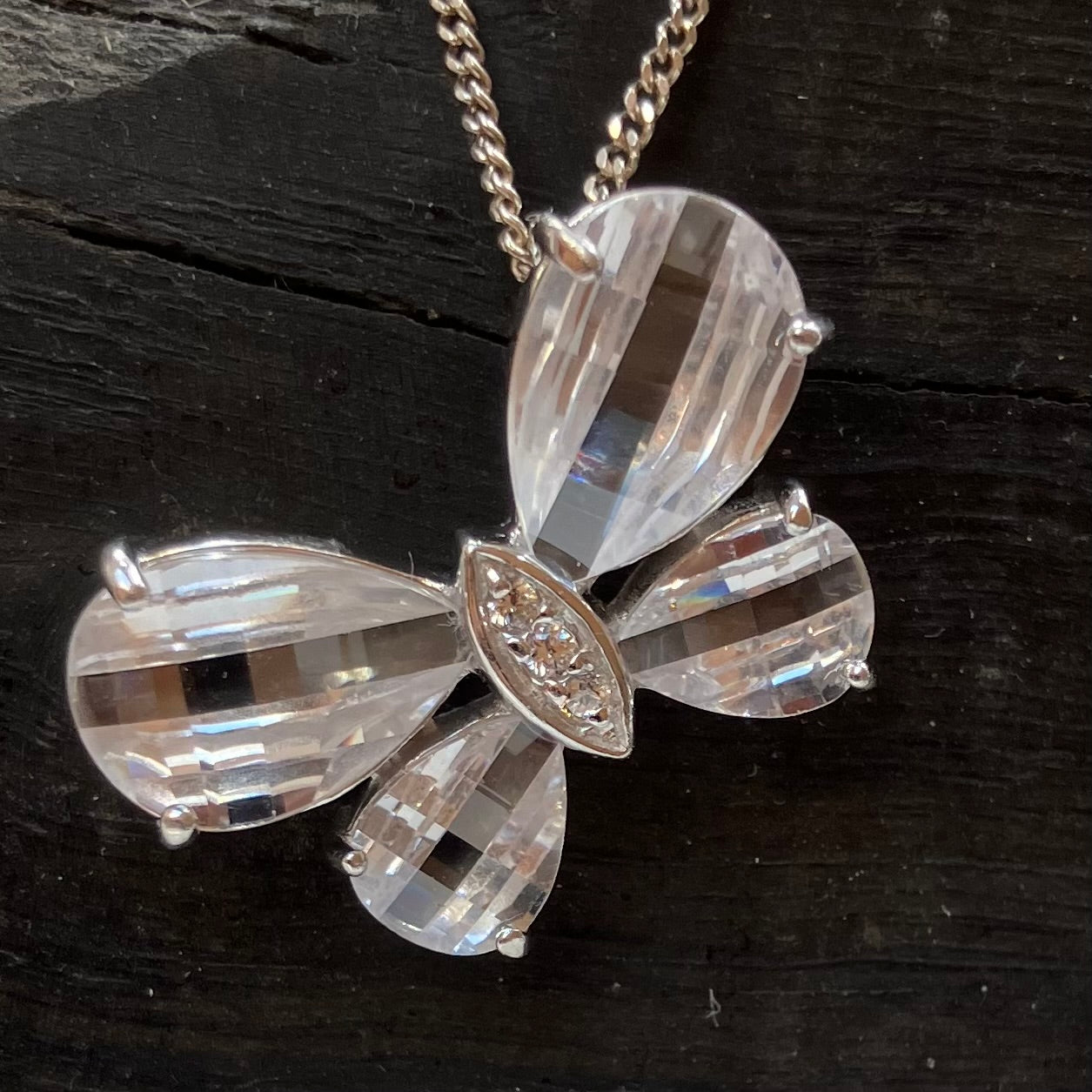 Irish Hallmarked Sterling Silver and White Cubic Zirconia Stone Butterfly Pendant on 16" Silver Curb Chain.