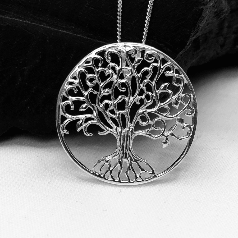 Large Round Tree Of Life Pendant, with beautiful curly branches, in Sterling Silver and on a 16" Silver curb chain.