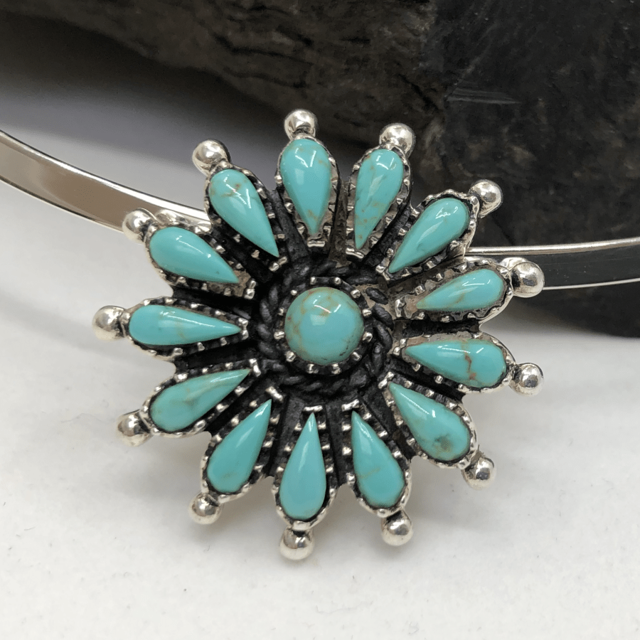 Sun Shaped Turquoise Pendant set in Sterling Silver and hung on a Silver Torc.